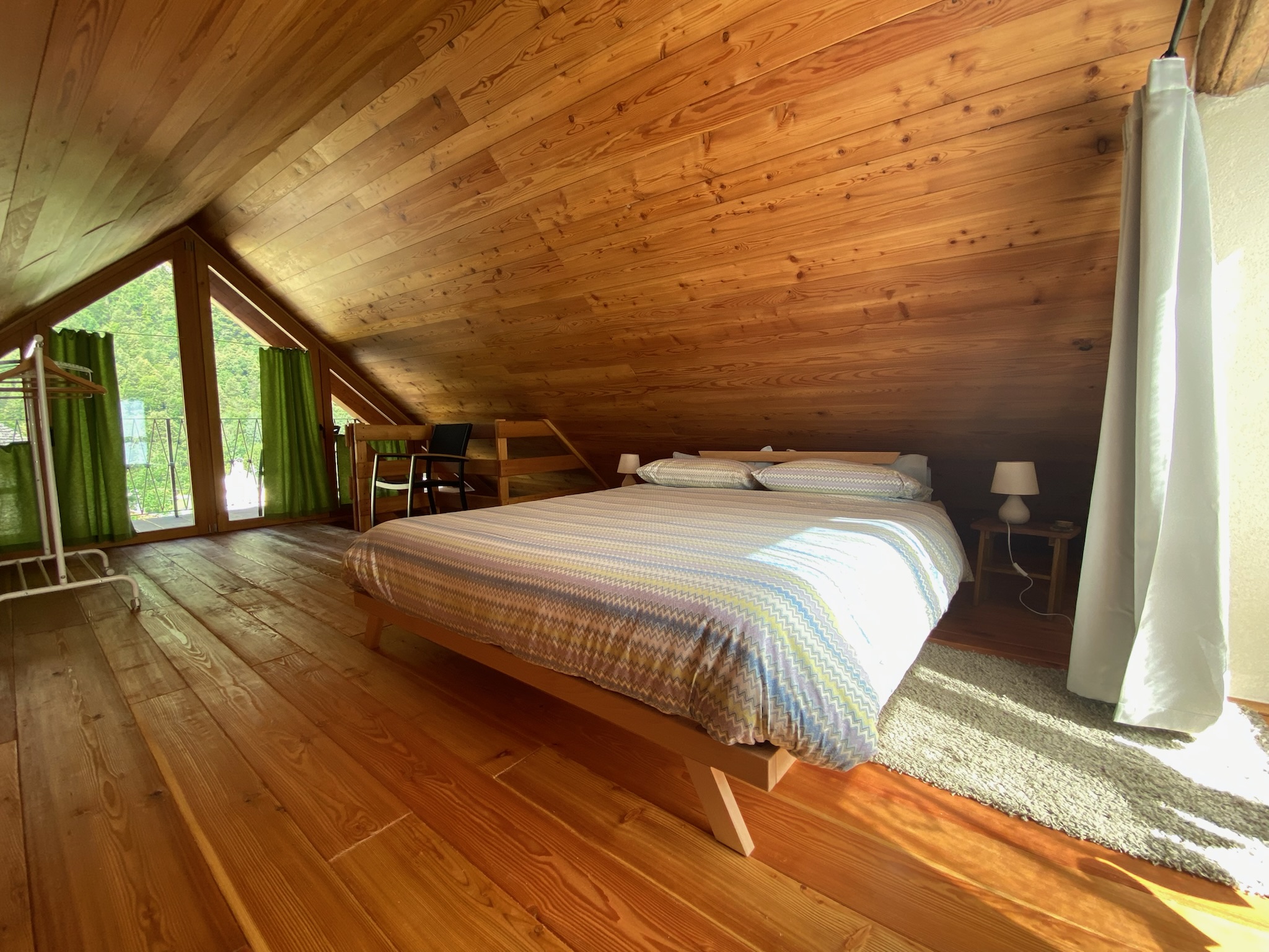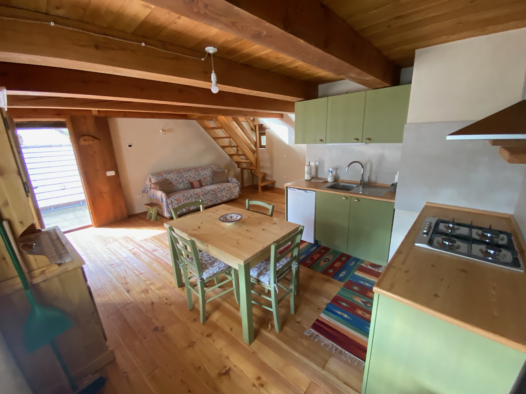 Cucina/soggiorno con divano letto matrimoniale certificato ad uso quotidiano, bagno, letto matrimoniale in zona soppalcata.